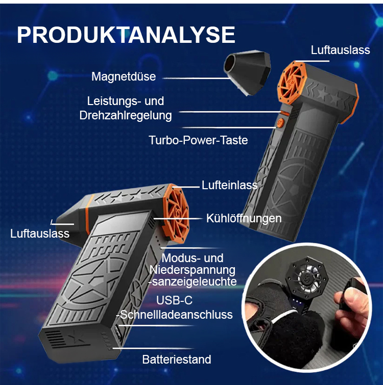 Ein Gerät – viele Funktionen: Schneebeseitigung, Staubentfernung, Feuer entzünden, Aufblasen, Vakuieren und vieles mehr!Kostenlose Probezeit – 14 Tage Rückgabe ohne Grund!